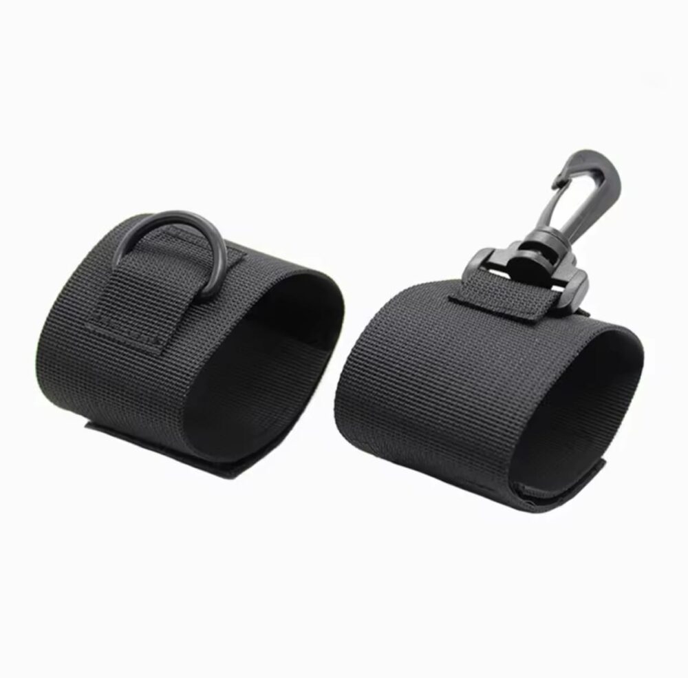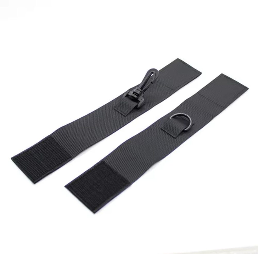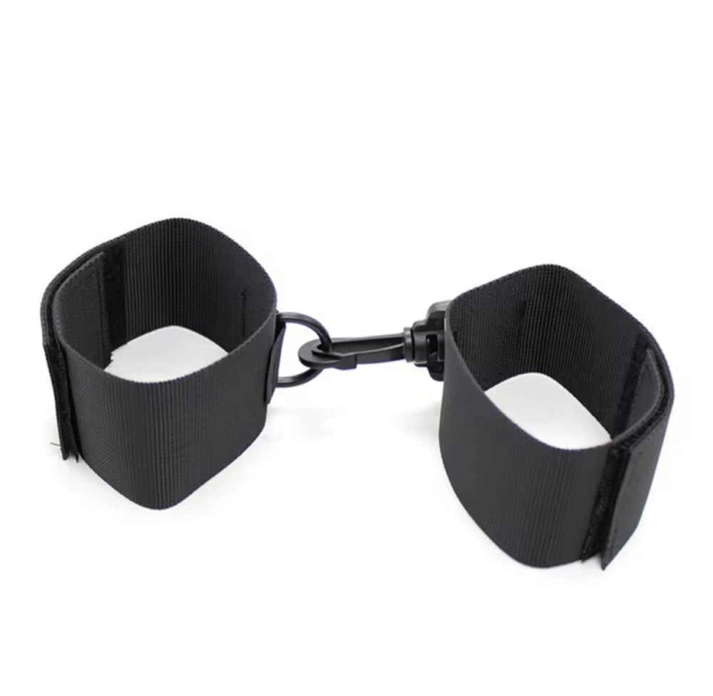 Esposas con ganchos para manos y tobillos, elaboradas en nailon color negro y cierre mágico para ajustar el tamaño. A su vez pueden atarse a través de un aro metálico. Puedes utilizarlas por separado o engancharlas en el aro formando una cruceta.