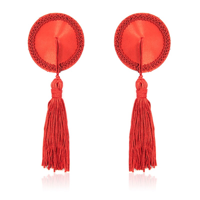 Pezoneras rojas satinadas, reutilizables, auto adhesivas, con forma circular, detalles de encaje y borlas. Se pueden usar hasta por 8 horas continuas. Son un complemento sencillo, fácil de usar y un componente erótico al que le sacarás mucho partido.