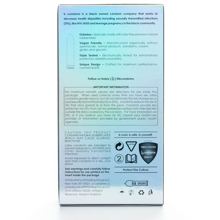 Disfruta de mayor comodidad y momentos inolvidables y seguros con los preservaivos B condoms. Elaborados de látex de caucho natural, lubricados, veganos, libres de parabenos, caseína, gluten y glicerina, sin olor industrial. Con un diseño de ajuste cómodo, lubricados con lubricante de silicona de pH equilibrado.